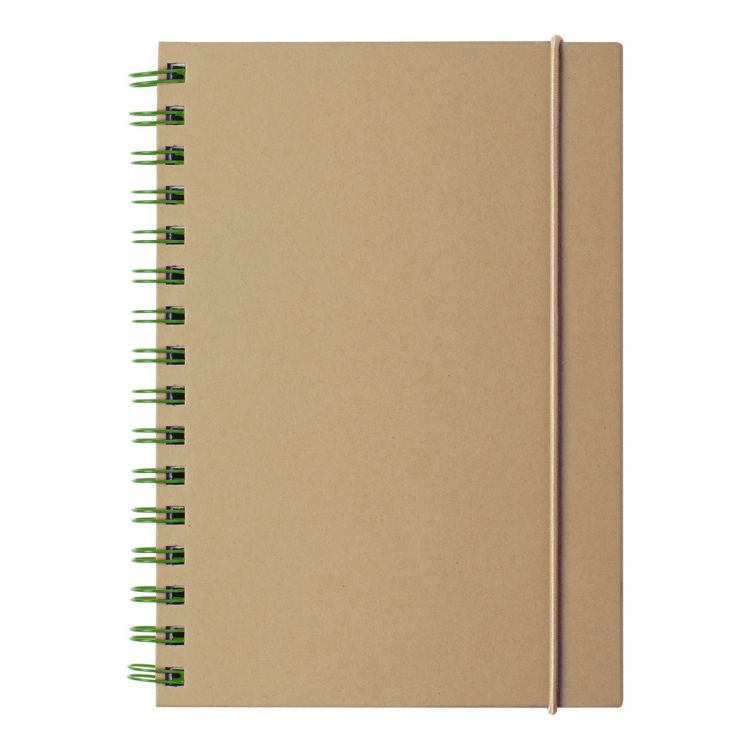 Quaderno a spirale con copertina in cartoncino riciclato ed elastico in gomma. 80 fogli a righe, formato A5.