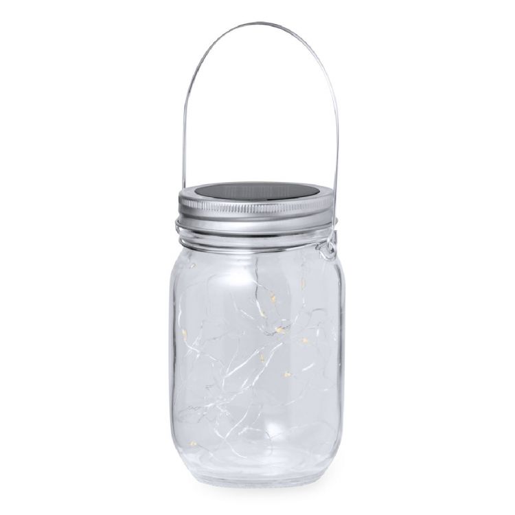 Originale lampada solare a barattolo, realizzata in resistente materiale di vetro e con una striscia interna decorativa di 20 LED. Include un coperchio a vite in metallo con mini-pannello solare ricaricabile integrato e una batteria ricaricabile da 300 mAh. Con pratico manico per il trasporto o per appenderla e presentata in una scatola di design kraft individuale. (colore nero)