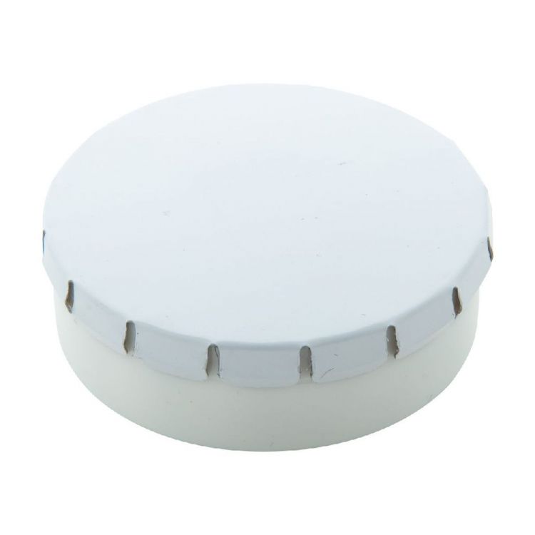 Scatola rotonda in plastica contenente circa 12 grammi di caramelle alla menta, con coperchio in latta di facile apertura, in colore bianco