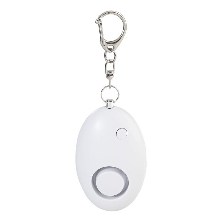 Segnalatore acustico di emergenza in ABS riciclato con moschettone metallico, portachiavi e torcia a 1 LED. L'allarme si attiva quando si tira la linguetta. Volume dell'allarme: circa 100 dB. Fornito con batteria a bottone
