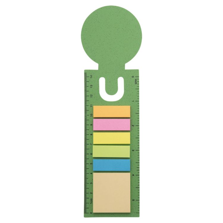 Segnalibro e righello in plastica ecologica in paglia di grano con 25 foglietti adesivi e 125 segnapagina (in 5 colori diversi).