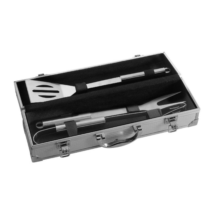 Set barbecue 3 elementi, composto da spatola, forchettone e pinza, in valigetta di alluminio, in colore argento