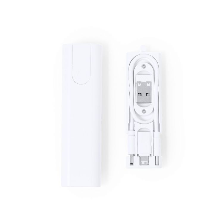 Set completo di cavi di ricarica in ABS resistente. Confezionato in una custodia compatta in resistente ABS bianco, con supporto per smartphone integrato. Include cavo di ricarica e di sincronizzazione, adatto per il trasferimento di dati e per connessioni multiple: Micro USB, Tipo C e Lightning; espulsore SIM incluso. 5V DC 3A. Presentato in una scatola dal design kraft. (colore bianco)