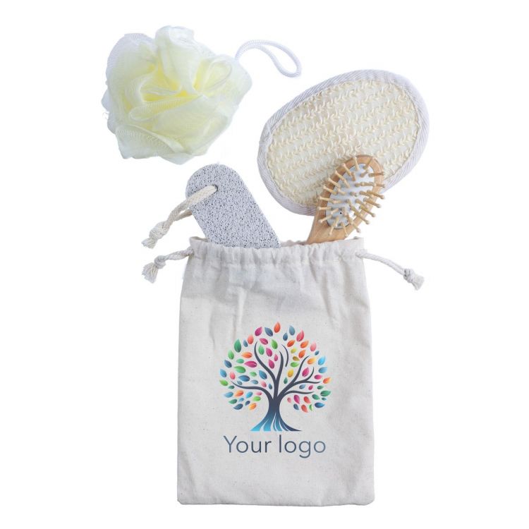 Set da bagno in cotone 4 pezzi, include spazzola in bambù, spugna morbida, spugna per lo scrub e pietra pomice (in sacchetto), confezionati singolarmente in sacchetto di cotone, in colore marrone chiaro