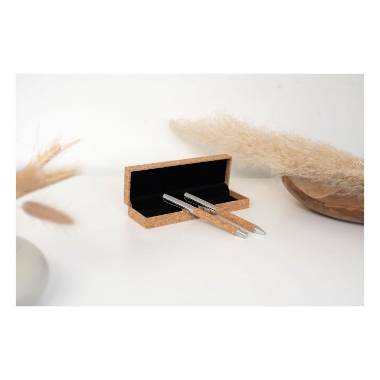 Set da scrittura in sughero composto da penna a sfera e penna roller, realizzati in una combinazione di sughero e metallo cromato, confezione regalo in sughero con rivestimento in velluto, refill blu, in colore marrone