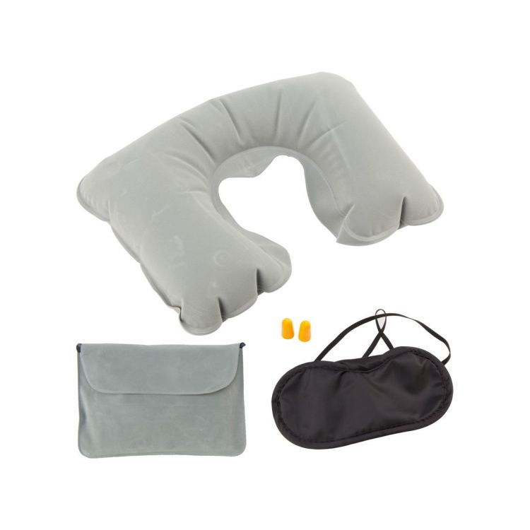 Set da viaggio composto da cuscino gonfiabile, maschera per gli occhi e tappi per le orecchie. Fornito con sacchetto in velluto di colore coordinato.
