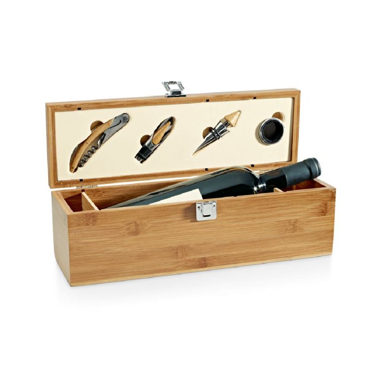 Set da vino in bambù, ABS e acciaio inox. Include un cavatappi con coltellino multiuso, un collare salvagoccia, un versatore con tappo e un tappo. Poiché il prodotto è realizzato con materiali naturali, il colore del prodotto e il risultato della stampa possono variare da un prodotto all'altro, in colore naturale