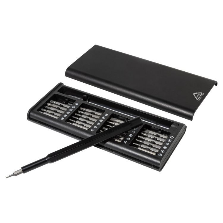 Set di cacciaviti di precisione con 24 punte in una custodia di ABS riciclato. Il manico del cacciavite è dotato di un attacco magnetico per un cambio rapido e sicuro delle punte.