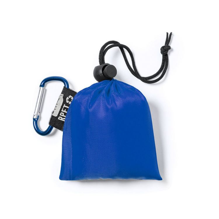 Poncho per adulti in materiale LDPE. In formato 102x127 cm e presentato in una custodia in poliestere RPET, realizzata con plastica riciclata, che favorisce il riutilizzo dei rifiuti plastici e aiuta la sostenibilità del pianeta. Custodia con moschettone abbinato per la portabilità e chiusura regolabile, disponibile in unampia gamma di colori. Con etichetta esterna in RPET. (colore blu)