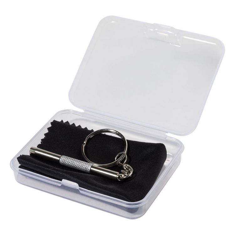 Kit compatto per la manutenzione degli occhiali contenuto in una scatola trasparente in PP. Il kit comprende un panno in microfibra 100% RPET (220 g/m²) e un mini cacciavite con portachiavi. Dimensioni del panno: 18×15 cm.