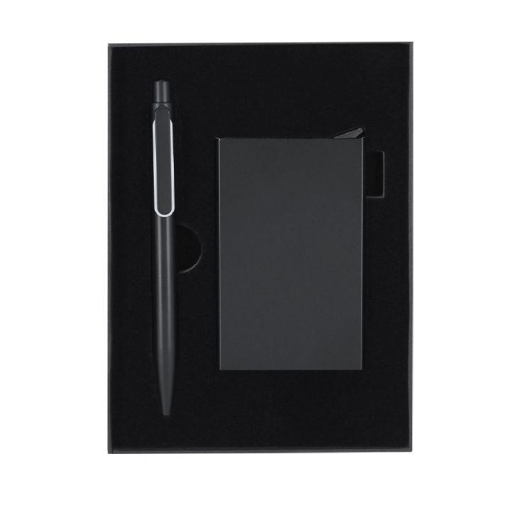 Set di penna e porta biglietti realizzati in Alluminio Riciclato.Il set include:- Penna in nero opaco realizzata in Alluminio Riciclato con meccanismo a pulsante con clip e elemento decorativo in metallo lucido.- Porta biglietti in nero realizzato in Alluminio Riciclato adatto per 6 carte con RFID e meccanismo a pulsante per estrarre le carte.Entrambi con logo di Alluminio Riciclato inciso e presentati in un'elegante scatola nera con interno sagomato.L'Alluminio Riciclato è un materiale con possibilità di riciclo quasi infinite, senza perdere le sue proprietà originali e consumando meno energia in questo processo.Certificazione GRS (Global Recycled Standard / Standard di Riciclo Globale), che garantisce l'origine riciclata del materiale utilizzato per realizzare il prodotto. (colore nero)