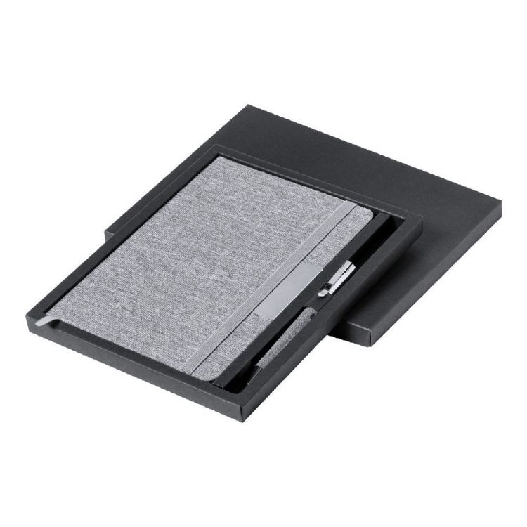 Quaderno formato A5 con copertina in poliestere 300D RPET, 100 fogli a righe, elastico di chiusura in gomma, penna a sfera in metallo con rivestimento in poliestere RPET e refill blu, in colore grigio