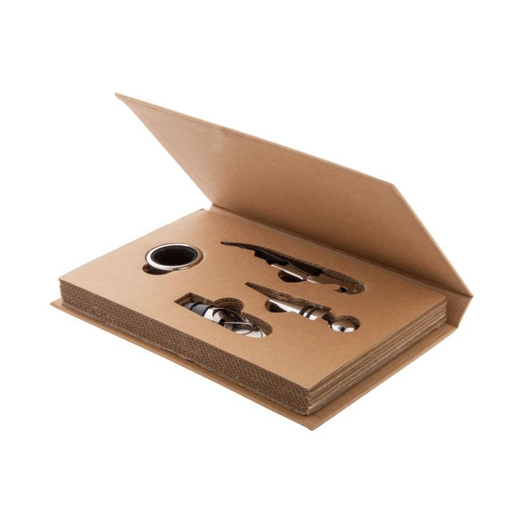 Set vino da 4 pz in acciaio inossidabile in scatola di cartoncino kraft riciclato ed apertura a libro. Il set si compone di cavatappi, salvagoccia, beccuccio e tappo