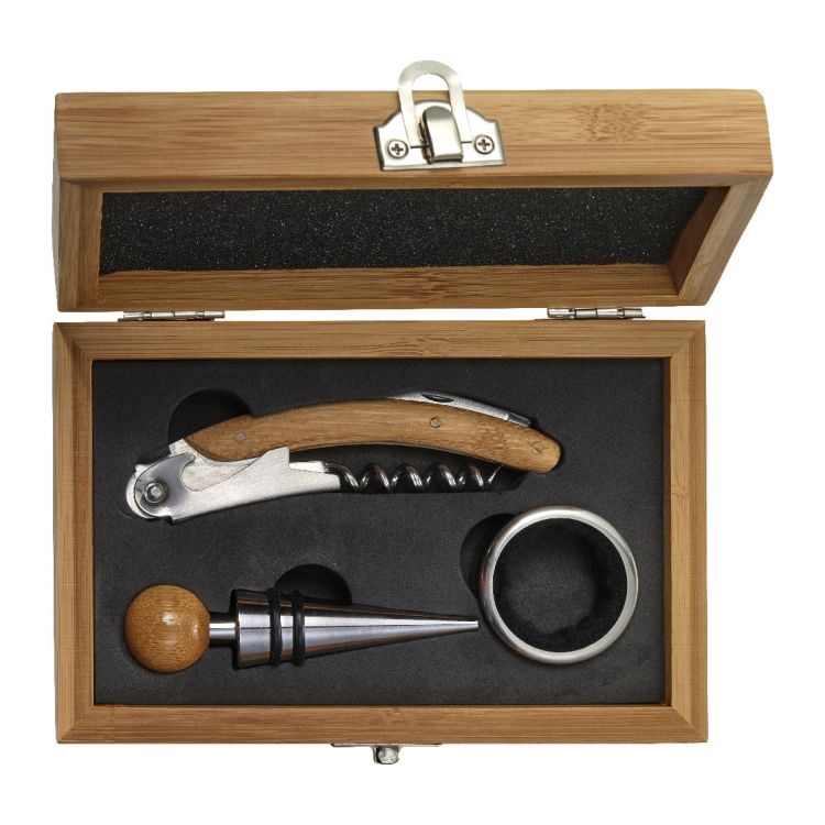 Set vino in bamboo ed acciaio inox, composto da 3 accessori: anello salvagoccia, tappo e cavatappi, confezione regalo, in colore marrone