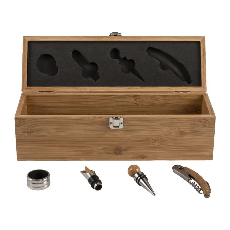 Set vino in bamboo ed acciaio inox, composto da 4 accessori: anello salvagoccia, beccuccio versatore, tappo e cavatappi, confezione regalo, in colore marrone
