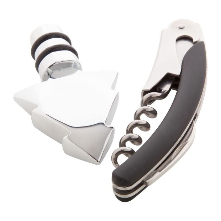 Set vino con cavatappi e tappo con decorazione albero di Natale sulla parte superiore. In scatola regalo in cartoncino nero