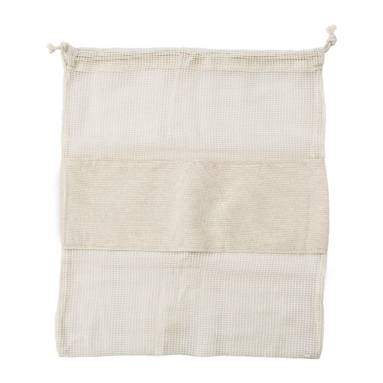 Set zaini in cotone biologico riutilizzabili, composto da tre sacche con rete, racchiusi in custodia di carta, chiusura a coulisse, pannello frontale adatto alla personalizzazione, in colore marrone chiaro