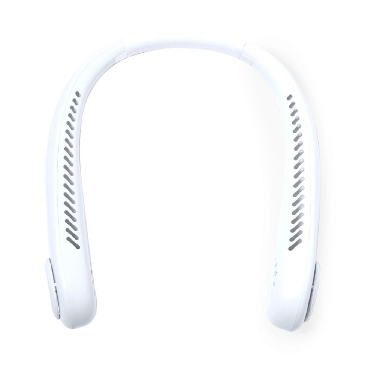 Pratico ventilatore portatile realizzato in resistente ABS. Questo elegante ventilatore ha un design a forma di collana da posizionare intorno al collo, fornendo una sensazione di freschezza. Offre tre diverse impostazioni di velocità ed è ricaricabile tramite la batteria da 800 mAh, cavo Micro USB incluso. Presentato in una scatola dal design kraft. (colore bianco)