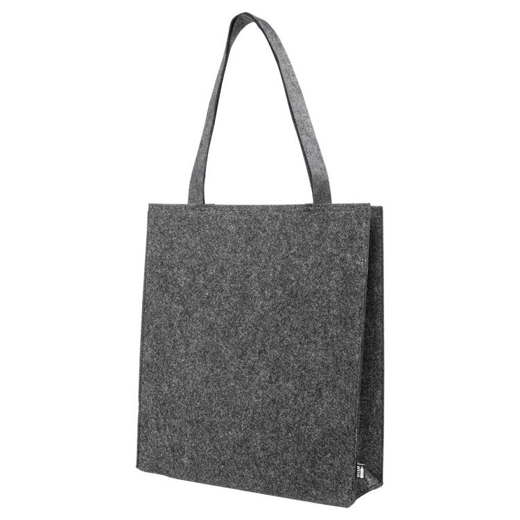 Shopper in feltro RPET con soffietto, manici lunghi ed etichetta RPET.