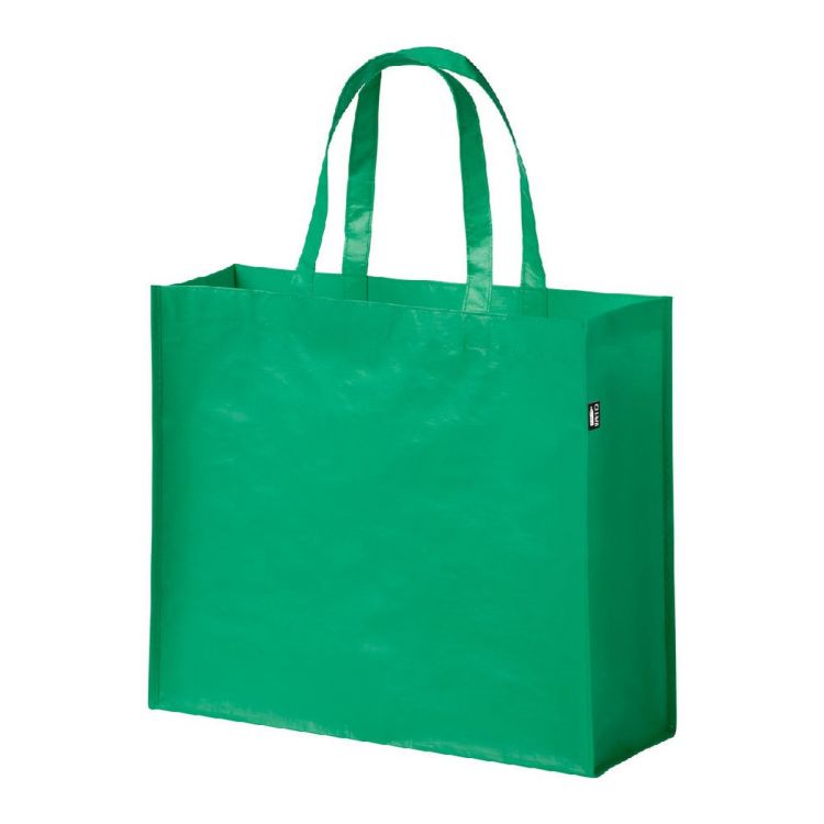 Shopper in poliestere RPET laminato con soffietto, manici medi ed etichetta RPET. 105 g/m².