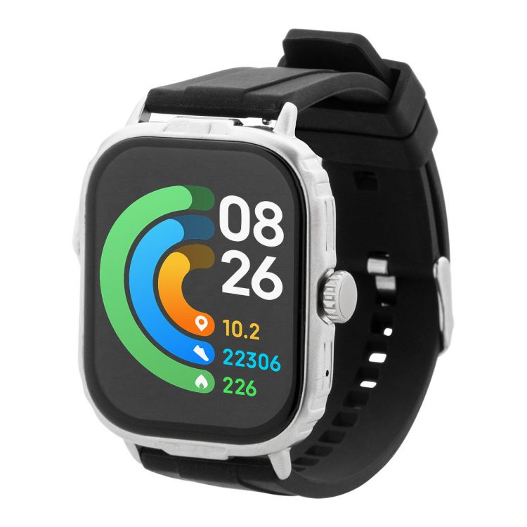 Smartwatch wireless multifunzionale con cassa in metallo, schermo touch screen TFT da 2,01", batteria ricaricabile da 210 mAh e cinturino in silicone. Dispone di diverse funzioni intelligenti e di monitoraggio della salute, come la frequenza cardiaca, la pressione sanguigna e il monitoraggio dell'ossigeno, oltre a molte altre. Può essere collegato agli smartphone con un'applicazione gratuita disponibile per iOS e Android. Include un cavo di ricarica USB magnetico. Resistente all'acqua IP65, in colore nero