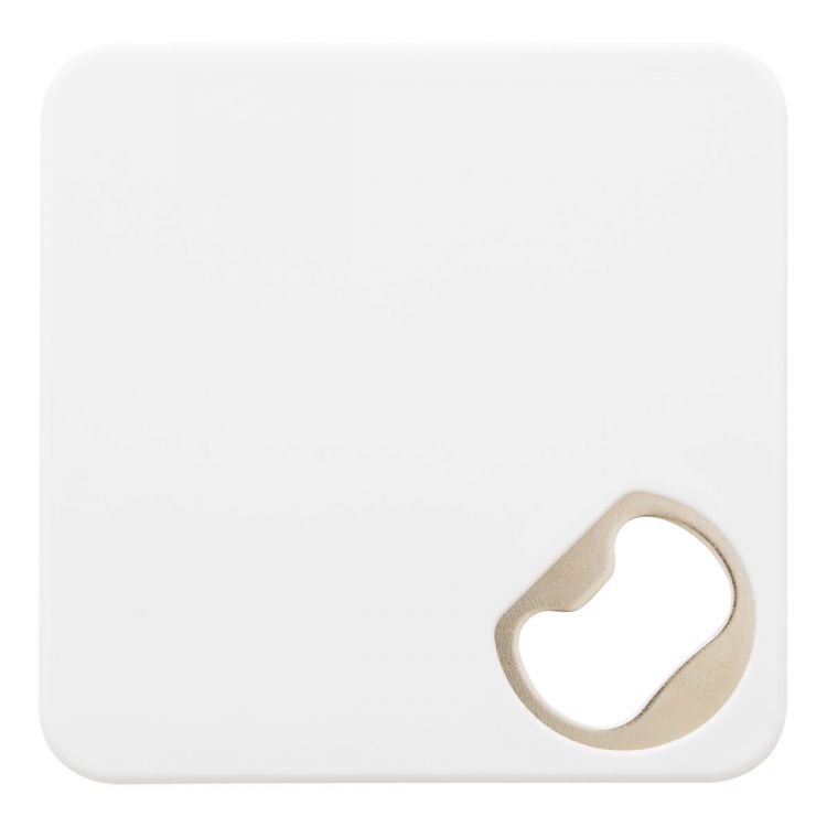 Sottobicchiere in plastica con apribottiglie in metallo e fondo antiscivolo, in colore bianco