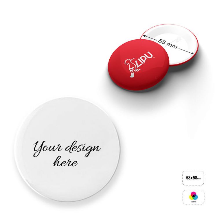 Spilla in latta, totalmente personalizzabile. Il prodotto STANDARD include l'inserto in carta plastificata con la stampa digitale full color e la chiusura con la spilletta da balia classica. Disponibili diverse finiture opzionali, a scelta tra: fluo che si illumina al buio, catarifrangente, vernice UV, argento, oro, carta effetto canva, effetto pelle di armadillo, effetto pelle di lucertola, glitter, rilievo. Disponibili anche diverse opzioni per il retro del badge, a scelta tra: apribottiglie con magnete, specchietto, chiusura senza spillo, bottone a pressione, clip in plastica, clip coccodrillo, magnete, lamina magnetica, chiusura magnetica.