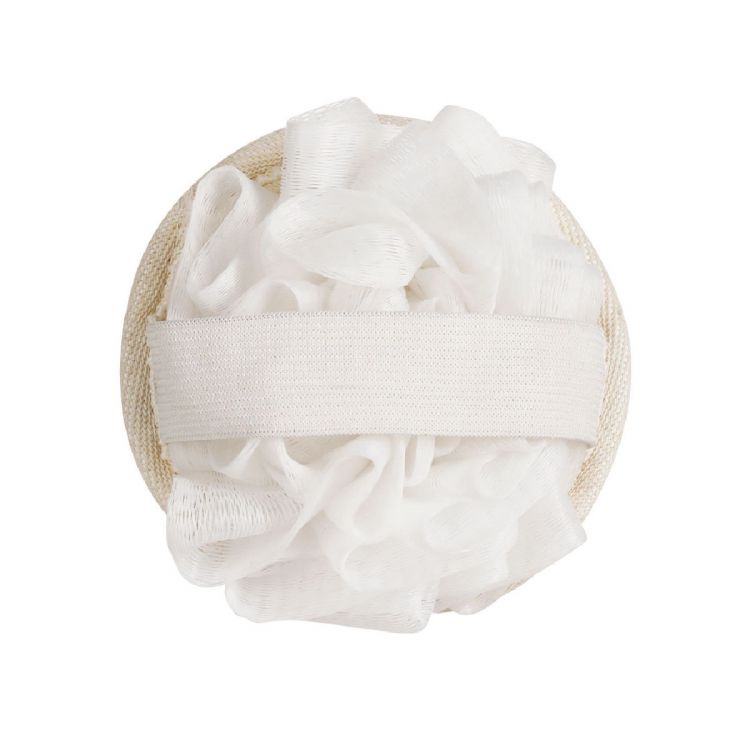 Spugna esfoliante 2 in 1 in fibra di PE. Da un lato, spugna morbida e dall'altro spugna esfoliante con cinghia di chiusura adattabile al palmo della mano. (colore naturale)