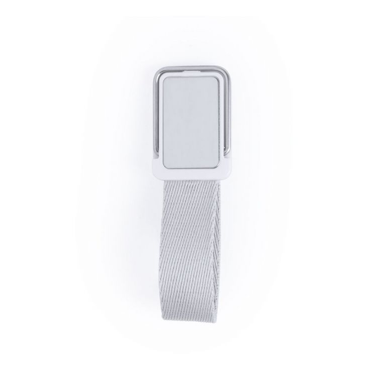 Originale supporto adesivo per smartphone con nastro per selfie in poliestere resistente e cuscinetto per la stampa centrale. Con supporto in metallo e presentato in un'attraente custodia di design. (colore grigio)