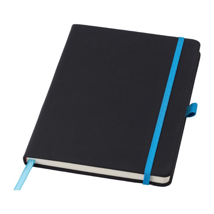 Taccuino formato +/- A5, include 96 fogli a righe, elastico colorato, passante per penna, con l'incisione laser sulla copertina il logo si mostrerà nel colore del dell'elastico, in PU