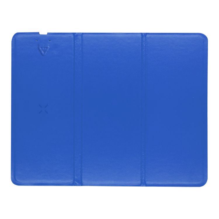 Tappetino per mouse ripiegabile in pelle PU riciclata con caricatore wireless integrato (10W) e funzione portacellulare. Con base antiscivolo in velluto e cavo di ricarica USB incluso.