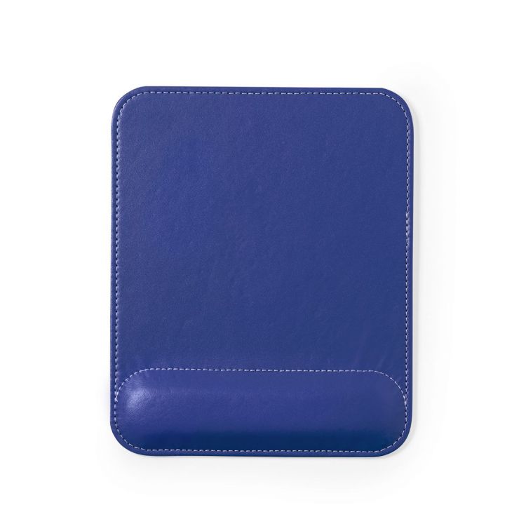 Tappetino per mouse realizzato in morbida similpelle, con contrasto bianco sulle cuciture. Base antiscivolo e poggiapolsi imbottito per prevenire stress e dolori articolari. .Presentato in scatola individuale (colore blu)