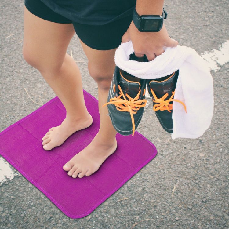 Pratico tappetino in PE dai colori vivaci, pensato per le attività sportive e ricreative in cui è necessario cambiare le scarpe e avere una superficie pulita per appoggiare i piedi.