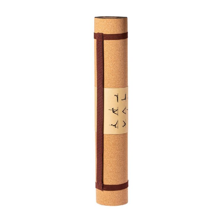 Tappetino da yoga in sughero naturale con fascetta in carta kraft e tracolla
