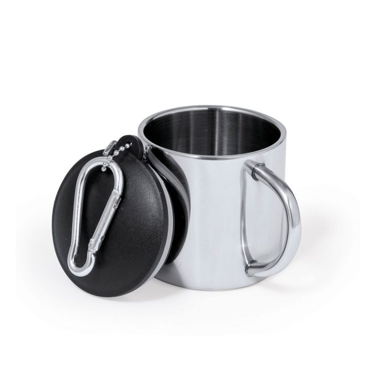 Tazza in acciaio inox a doppia parete da 145 ml. Design lucido con coperchio nero a scatto a tenuta ottimale grazie all'anello in silicone, dotato di un pratico moschettone per un facile trasporto. Presentata in una scatola individuale dal design kraft. (colore argento)