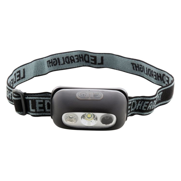 Lampada frontale in plastica con batteria ricaricabile USB integrata (400 mAh) e fascia regolabile. Dispone di luce COB ad alta potenza e doppio sensore di movimento. Modalità di luce elevata, bassa e in risposta al movimento. Fornita con cavo di ricarica USB