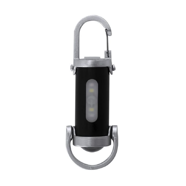 Torcia in ABS con moschettone da trasporto. 4 LED, sistema di accensione a pulsante e 8 luci COB. 7 posizioni con luci fisse e lampeggianti. Maniglia pratica in fondo. Batteria ricaricabile da 400mAh, con cavo di ricarica 5V Tipo C incluso. (colore nero)