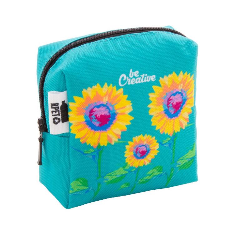 Trousse per cosmetici quadrata in poliestere 600D RPET con stampa in sublimazione su tutta la superficie e zip. MOQ: 50pz.