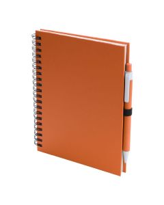 TaccuinoTaccuino ad anelli con copertina soft touch in robusto cartone riciclato bicolore, chiusura elastica sulla copertina e penna in cartone riciclato abbinata. Colori vivaci, 60 pagine lisce e portapenne sul retro della copertina.