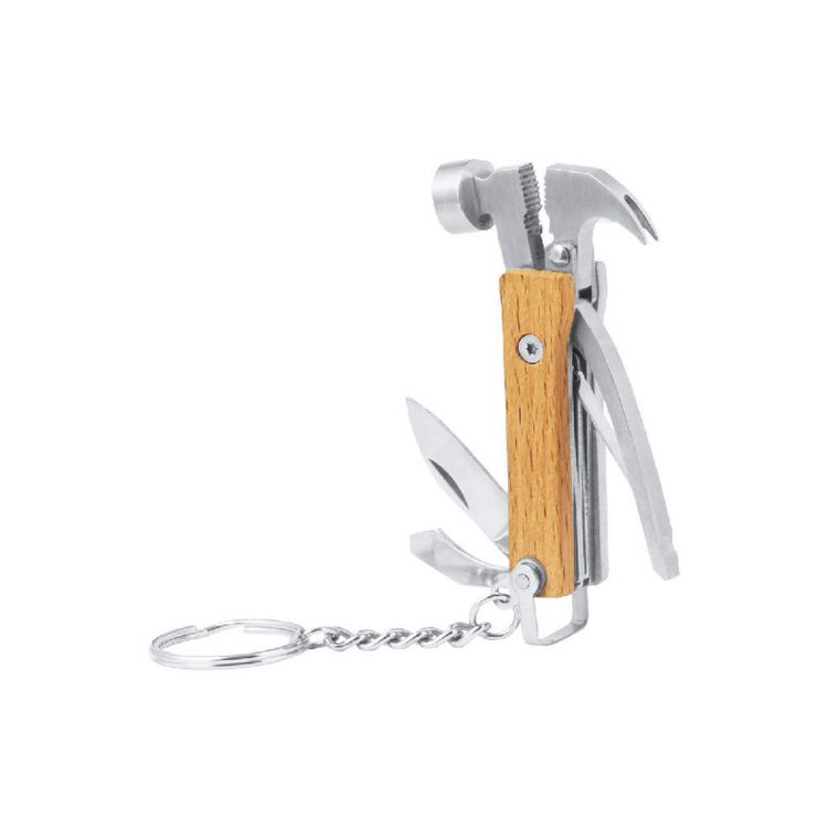 Utensile multifunzione in acciaio inox con manico in legno e 7 funzioni. Con portachiavi in metallo