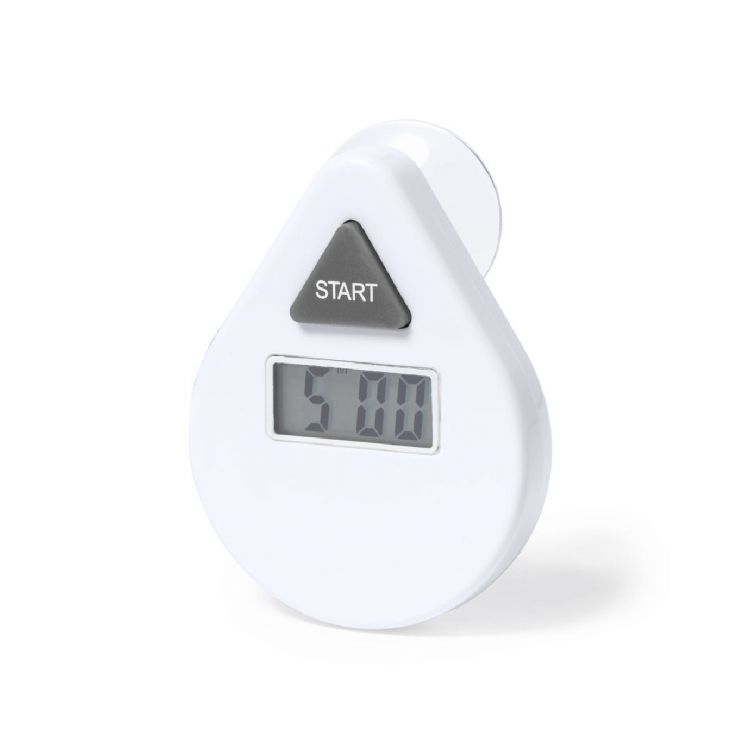 Timer in ABS resistente con finitura bianca e fissaggio a ventosa. Display LCD di facile lettura, con pulsante di controllo del conto alla rovescia (5 minuti). Alimentazione a batteria (pile a bottone incluse). Presentato in una scatola kraft individuale, con manuale di istruzioni in inglese e spagnolo. (colore bianco)