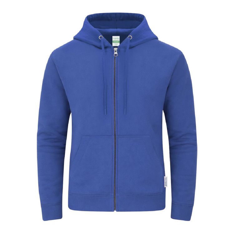 Felpa con cappuccio e zip unisex in cotone biologico e poliestere riciclato, in soffice pile trapuntato da 280 g/m². Con cappuccio a doppio strato foderato, cordoncini regolabili rotondi - con fermagli abbinati - e occhielli metallici. Polsini e fondo in costina elastica, e tasca canguro anteriore. Apertura a zip metallica nascosta, con copertura di cucitura rinforzata sul collo. Inclusa etichetta ecologica distintiva.