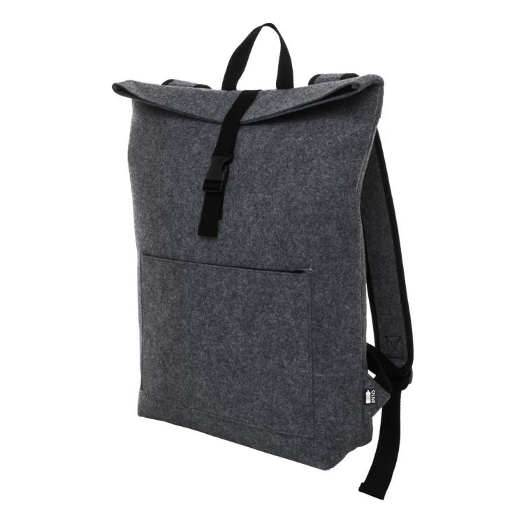 Zaino rolltop in feltro RPET con scomparto principale chiuso da fibbia e tasca frontale con cerniera, scomparto per computer portatile (15"), spallacci imbottiti ed etichetta RPET.