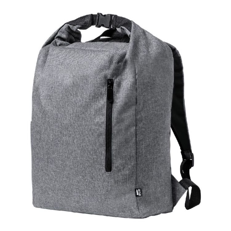 Zaino rolltop impermeabile RPET con tasca laterale, tasca frontale con cerniera, schienale e spallacci imbottiti. Con etichetta distintiva RPET. Poliestere 300D RPET.