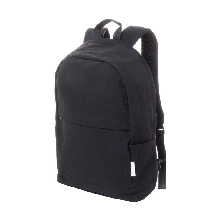 Zaino in tela riciclata con scomparto principale e tasca frontale chiusi da cerniera, scomparto imbottito per computer portatile (15"), tasche laterali, cinghia per trolley, schienale e spallacci imbottiti e tasca antifurto nascosta. 70% cotone riciclato e 30% poliestere RPET. Etichetta cotone riciclato.