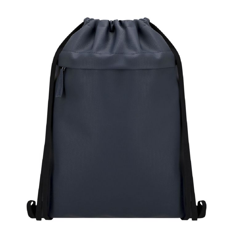 Zaino con cordini realizzato in morbido PU abbinato a resistente poliestere 600D. Con tasca frontale funzionale con chiusura a zip e tiralampo coordinato in PU.