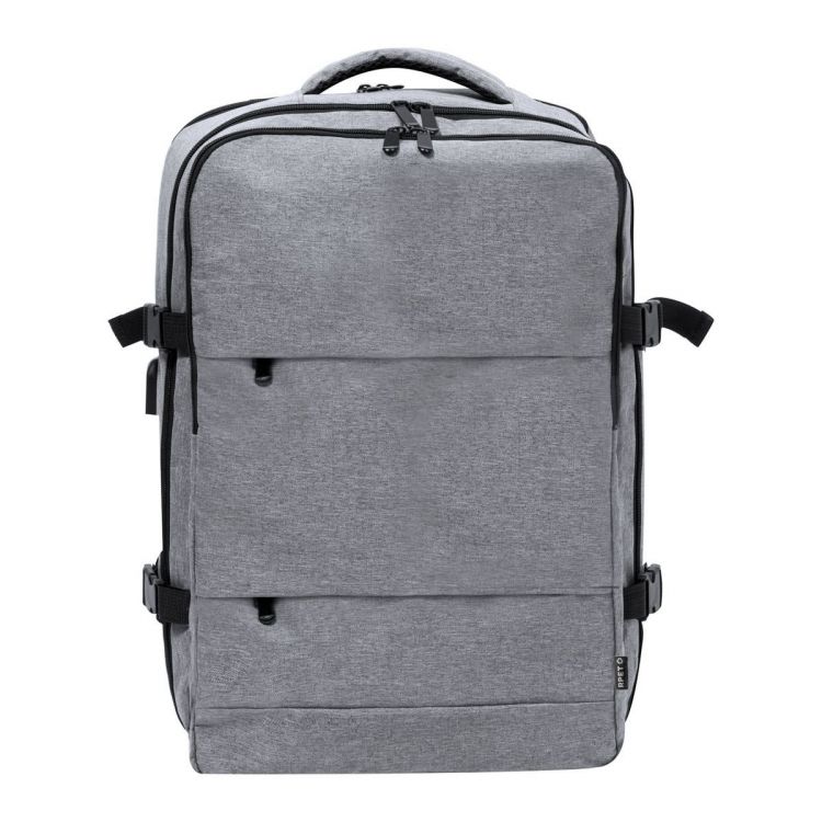 Zaino RPET resistente all'acqua con 3 scomparti principali con cerniera, 2 tasche anteriori con cerniera, tasca laterale con cerniera e tasca antifurto nascosta. Con scomparti imbottiti per laptop (17") e scarpe, schienale e spallacci imbottiti. Con cinghia per trolley e connessione USB integrata per power bank. Poliestere RPET 300D con etichetta distintiva RPET.