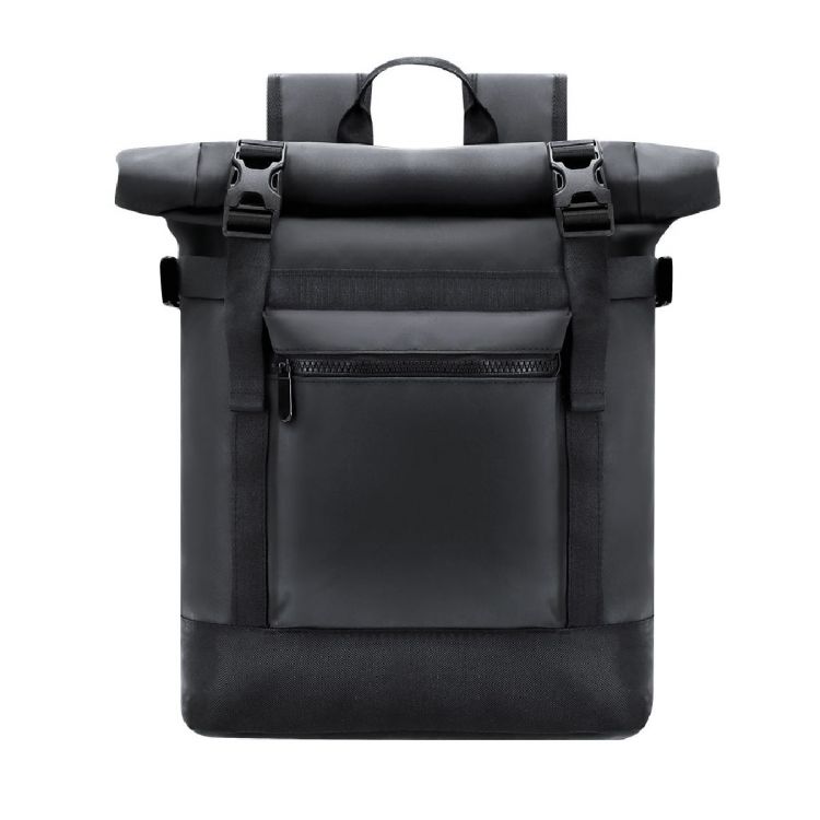 Zaino realizzato in PVC morbido, dotato di sistema di chiusura roll-top con fibbie. Dispone di una tasca con chiusura a zip. L’interno capiente include uno scomparto imbottito per laptop fino a 15 pollici e tablet fino a 10 pollici. Le cinghie laterali regolabili consentono di compattare il volume in base alle esigenze. Spallacci in PU e schienale imbottito garantiscono un comfort superiore. Include una fascia posteriore per il fissaggio a trolley o valigia, ideale per viaggi e spostamenti. (colore nero)