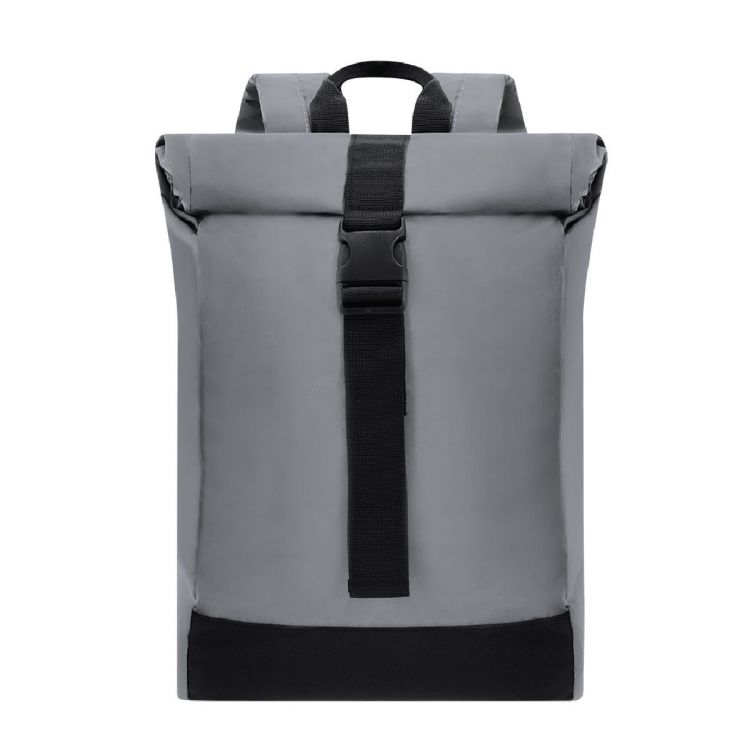 Zaino realizzato in poliestere 190T riflettente, morbido ma resistente. Dotato di sistema di chiusura roll-top con fibbia regolabile. L’interno capiente include uno scomparto imbottito per laptop fino a 15 pollici. Spallacci e schienale riflettenti per una maggiore visibilità. (colore grigio)