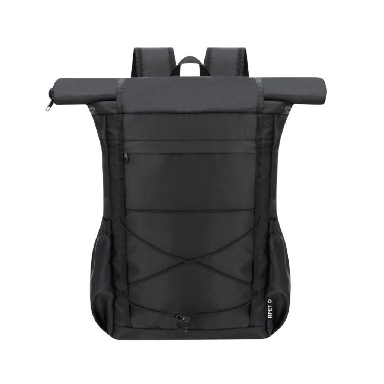 Zaino realizzato in poliestere 290D RPET con sistema di chiusura con zip arrotolato e una seconda chiusura in velcro. Ha una tasca anteriore con una cerniera invisibile, oltre a un elastico regolabile sul davanti. Due tasche laterali aggiuntive. Interno di grande capacità con compartimento imbottito per laptop fino a 15 pollici. Bretelle imbottite su spalla e schiena per maggiore comfort. Logo RPET sull'etichetta esterna. (colore nero)